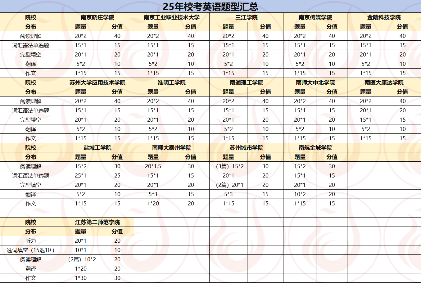 今天给大家整理了2025年15个本科院校校考英语的考试题型: